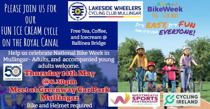 LSW Ice-Cream Spin 2026 May 14 @ 6:30 pm - 8:30 pm Old Rail Trail Greenway Old Rail Trail Greenway, Mullingar, Westmeath Join us for a leisurely social spin along the Greenway. Stopping in Ballinea Bridge for complimentary refreshments, tea, coffee and ice-cream. Everyone welcome.