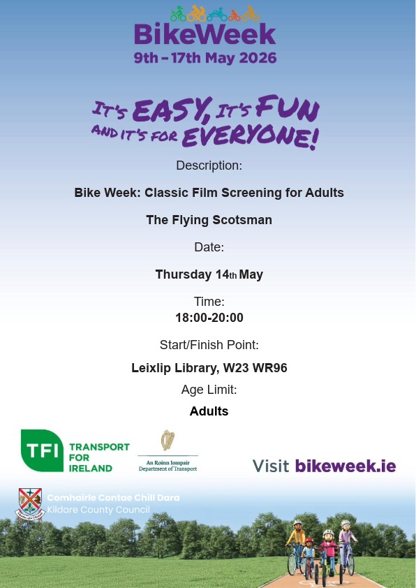 To celebrate the art of biking for Bike Week, Leixlip Library will be screening The Flying Scotsman. Graeme Obree, a bike shop owner facing financial difficulties, embarks on a remarkable […]