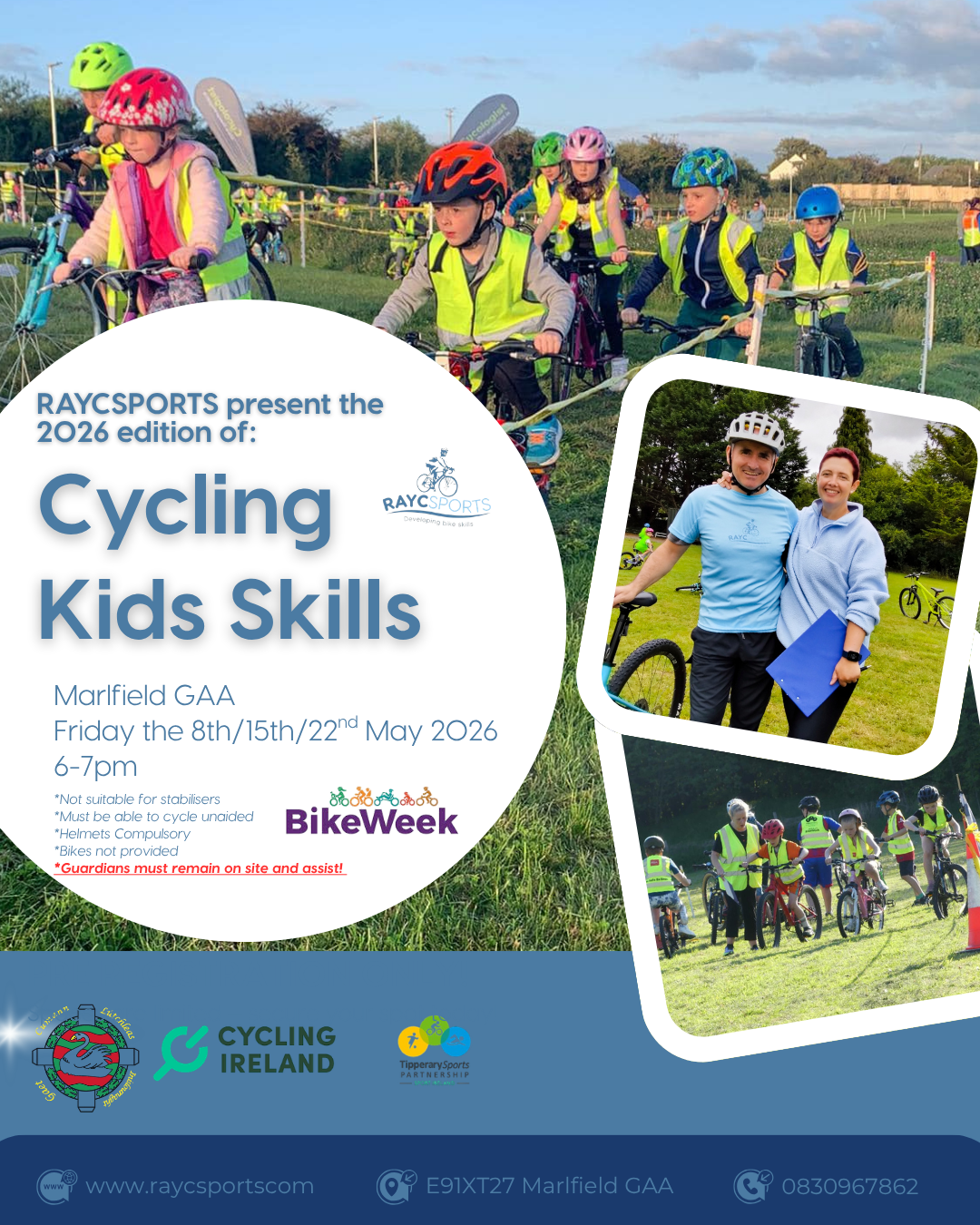 Fun on 2 Wheels for Bike Week 2026 at Marlfield GAA Beginning Saturday 9th May @ 6PM Two follow-up sessions on the 15th & 22nd May. Bring your own bike!