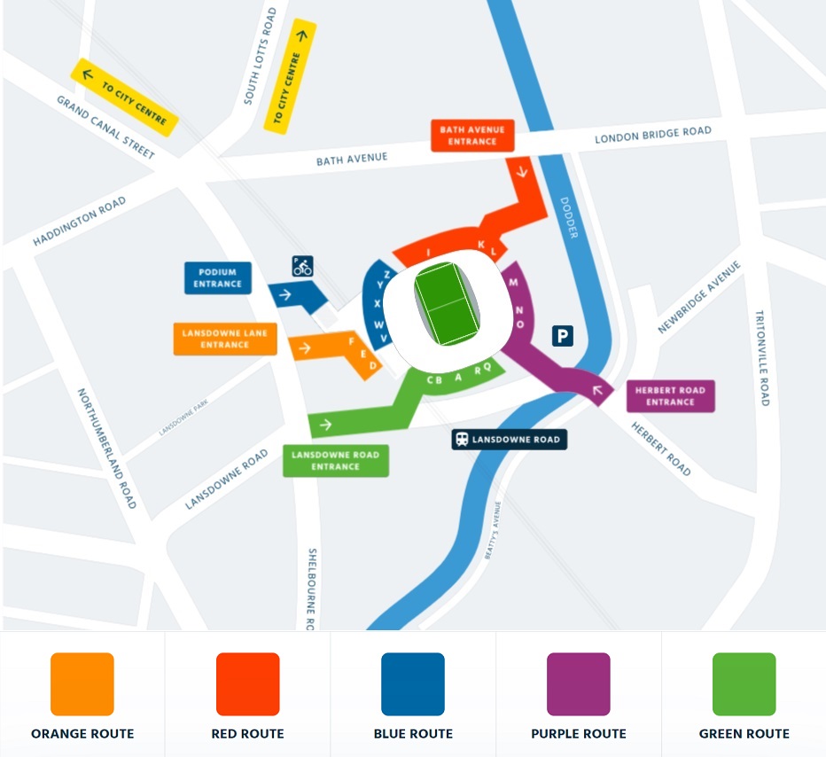 From Nassau Street at Trinity College (city centre), travel along Merrion Square and Lower Mount Street. Cross the canal and continue along Northumberland Road to the second set of lights. Turn left onto Lansdowne Road. Continue through the next junction. Aviva Stadium is on your left.