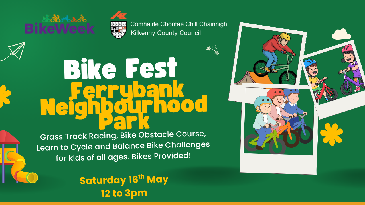 All welcome to join for a Slow Roll through Kilkenny City Streets, meet at The Parade at 11am, all ages welcome, bring your own bike in good working order. Off-road track at County Hall from 12pm to 3pm. Try out Grass Track Racing, Obstacle Courses. Learn to cycle available for younger children, bikes available.