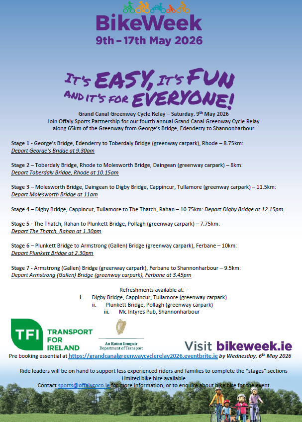 Join Offaly Sports Partnership for our fourth annual Grand Canal Greenway Cycle Relay along 65km of the Greenway from George’s Bridge, Edenderry to Shannonharbour Stage 1 - George’s Bridge, Edenderry […]