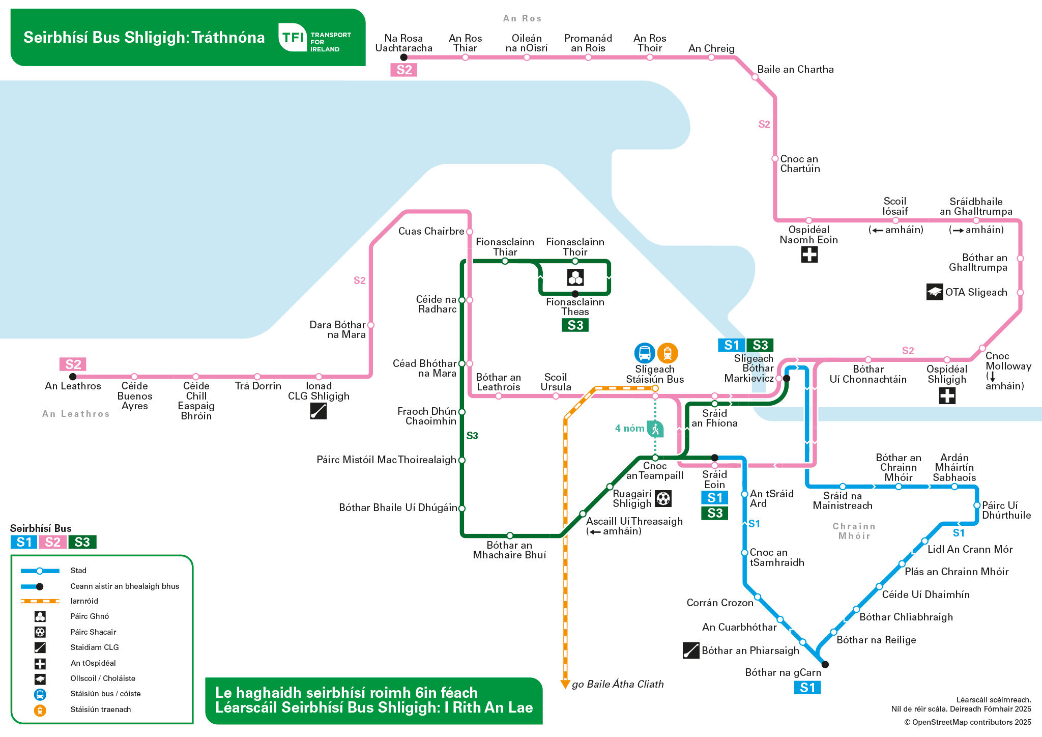 Tá trí bhealach á reáchtáil ag Bus Éireann i mBaile Shligigh thar ceann Transport for Ireland.