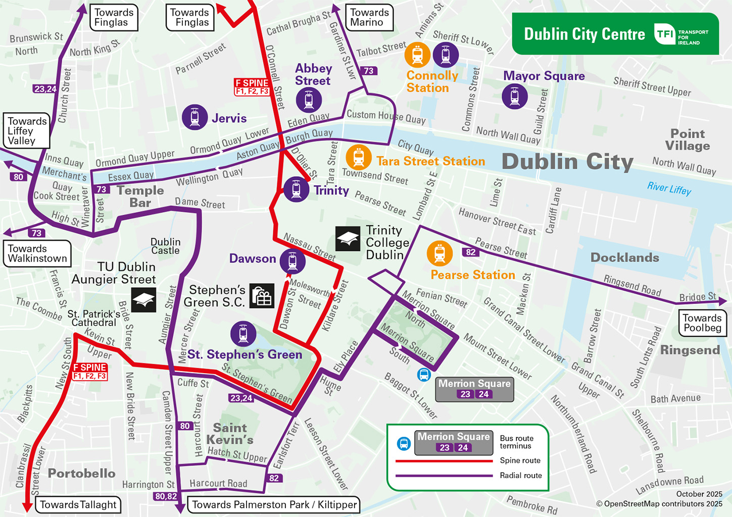 For journeys to and from O’Connell Street and northside destinations, please transfer between routes 80 and F1 at the junction of Kevin Street and Aungier Street.