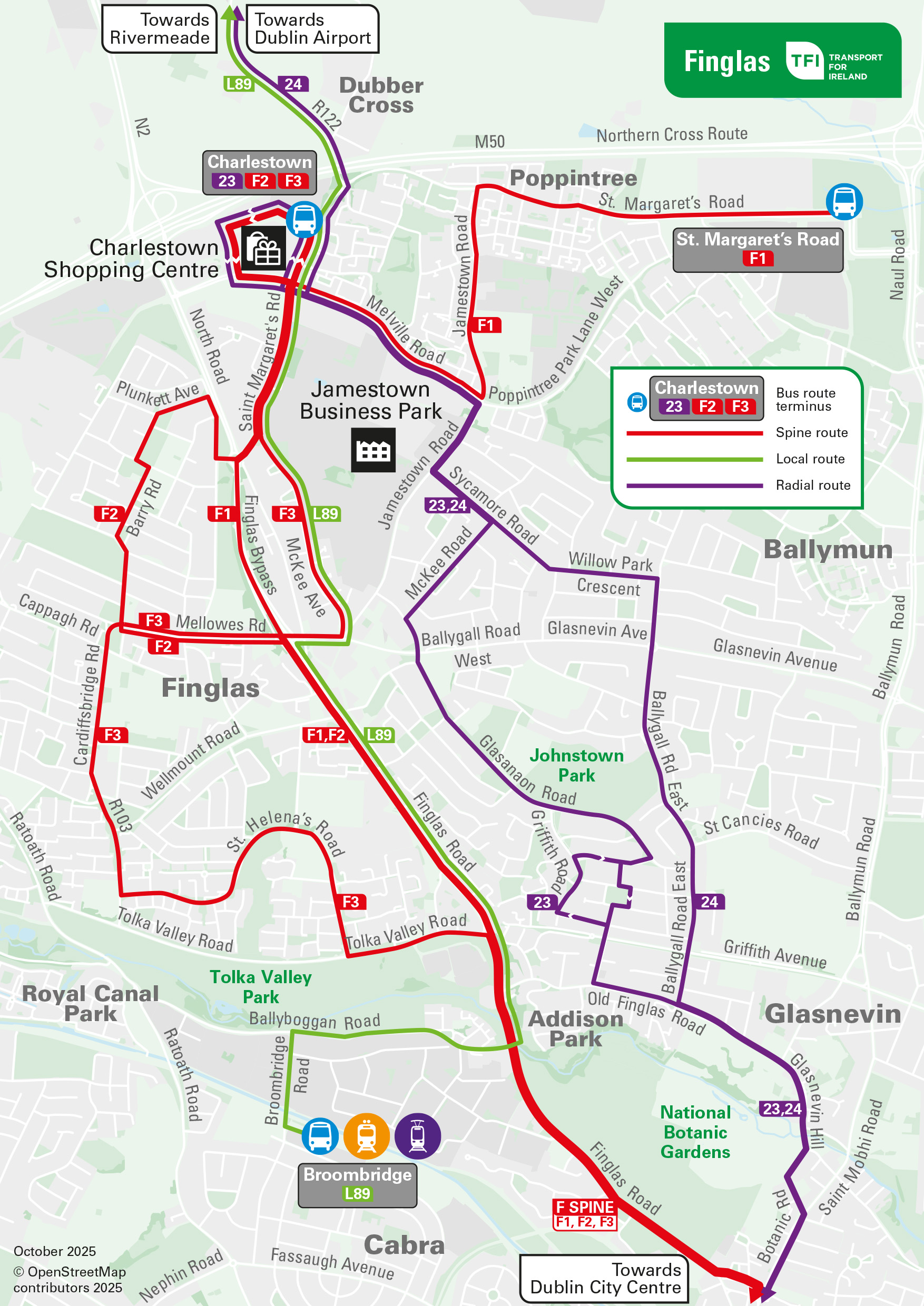 For journeys to the City Centre, please transfer to “F-Spine” route F1 at McKelvey Avenue or to the Luas Green Line at Broombridge.