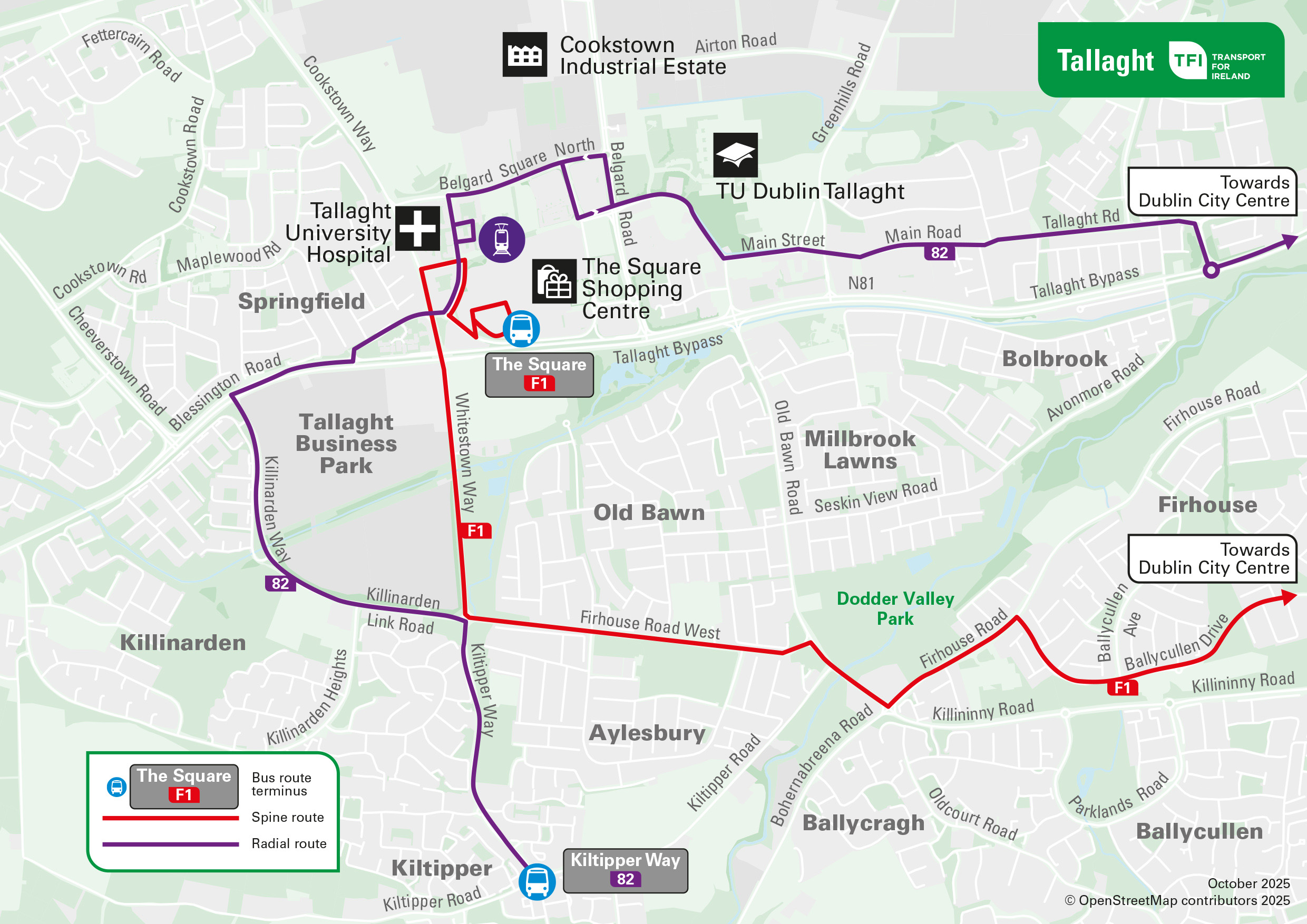 In Firhouse, new route F1 takes the more direct alignment to and from Tallaght along Ballycullen Drive.